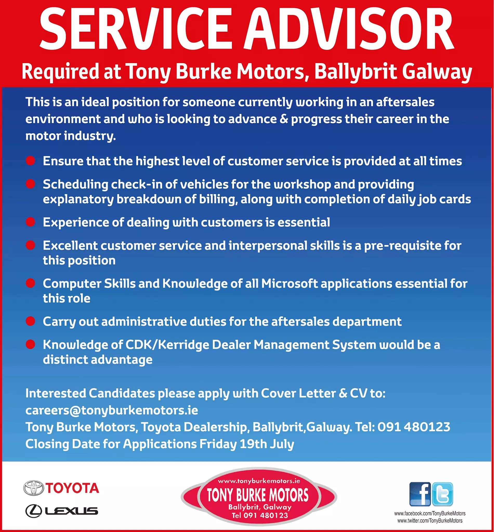 Tony Burke Motors On Twitter Service Advisor Required At Tony Burke Motors Toyota Amp Lexus Retailer Ballybrit Galway Jobs Jobsgalway Https T Co Fbzfdnymqo Twitter